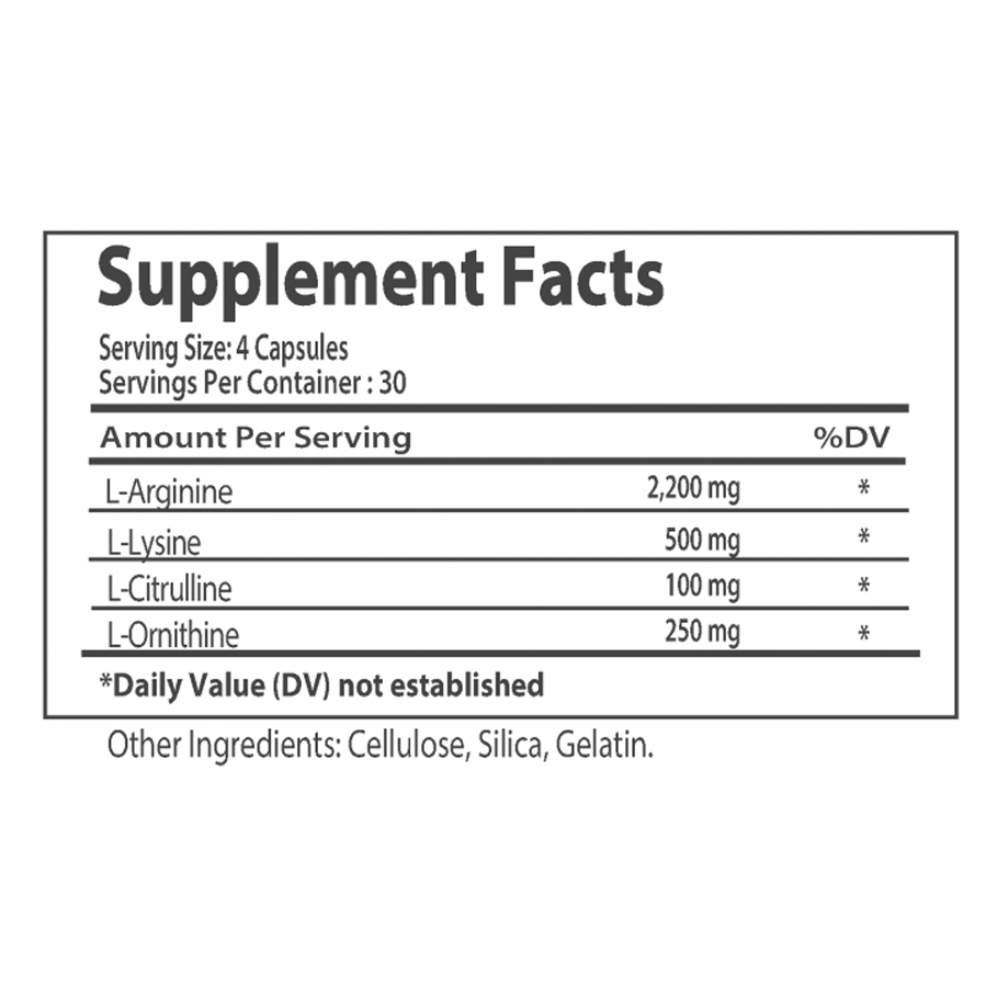 One serving (4 capsules) contains 1250 mg of L-Arginine,