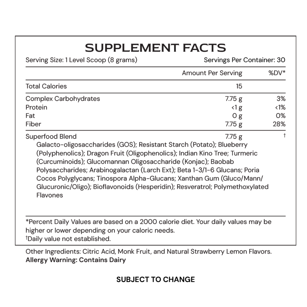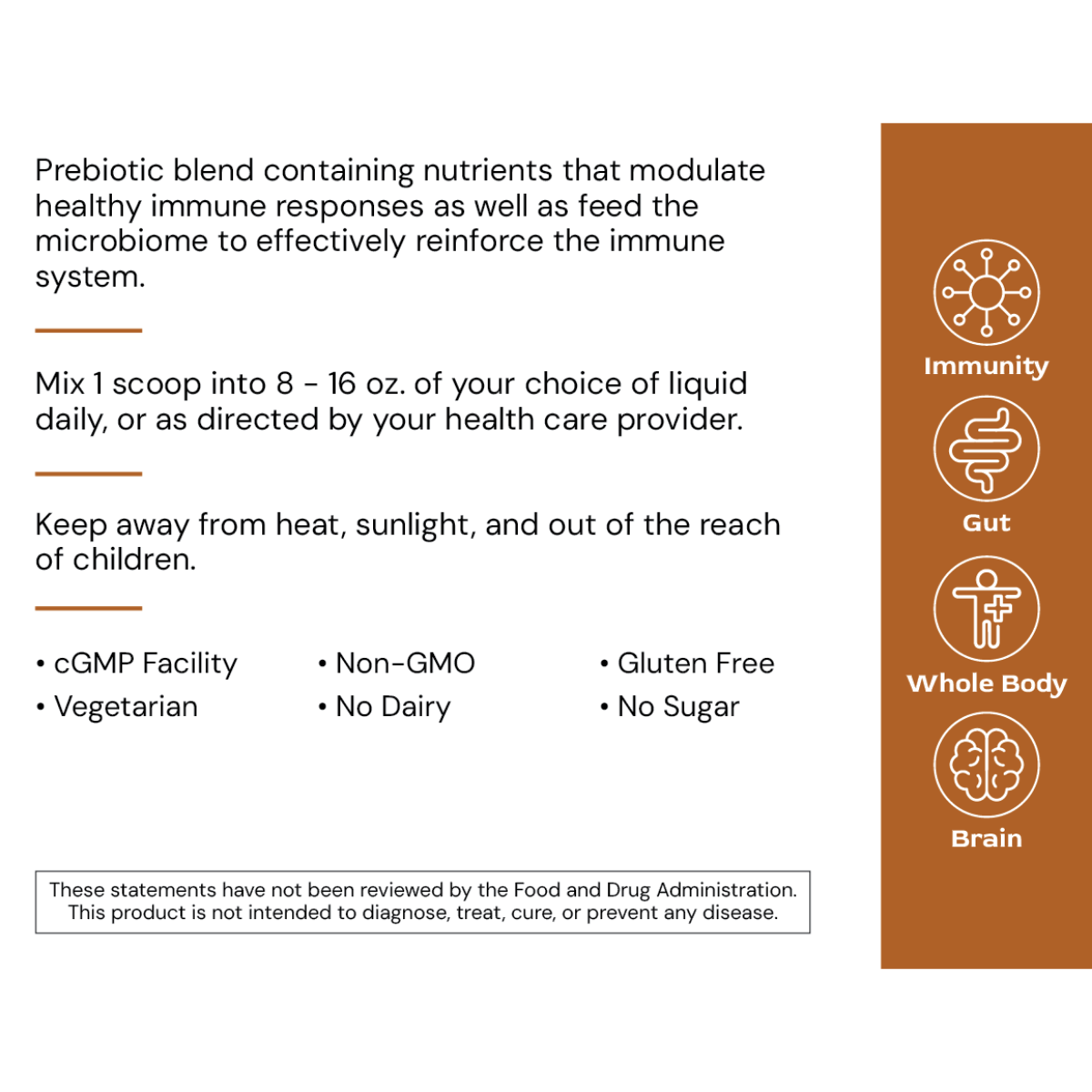 Immune Superfood is a prebiotic blend containing nutrients that modulate healthy immune responses as well as feed the microbiome to effectively reinforce the immune system.