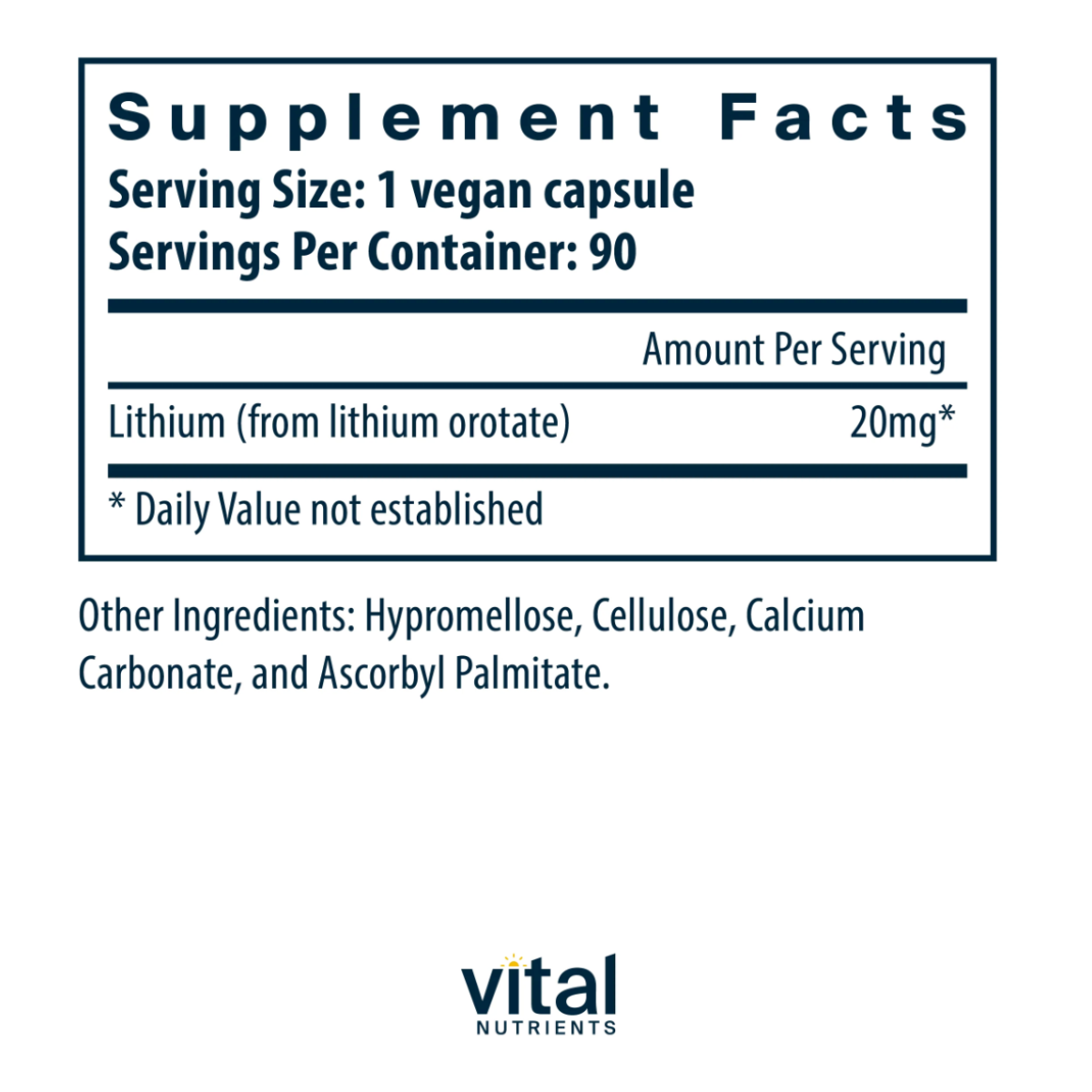Lithium is an alkali metal found in trace amounts of most rocks, as well as mineral springs, ocean water, and nearly all vertebrate tissue.* Vital Nutrients offers low-dose lithium supplied as lithium orotate, a bioavailable salt. Lithium supports the phosphoinositol pathway. Lithium may be used to promote a healthy balanced mood and behavior* Additionally, Lithium may help resist both the mental and physical effects of stress.*