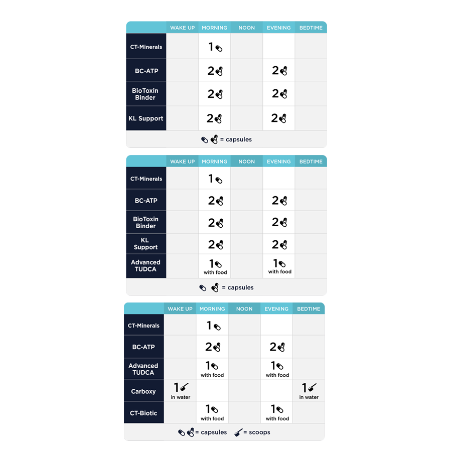 The MYC Support Protocol is a four-month approach to optimizing cognitive and mitochondrial function, promoting the body’s natural ability to detoxify, and supporting the gut microbiome, liver, and respiratory system. It includes the Jumpstart Kit, MYC Support Kit, and Advanced MYC Support Kit.