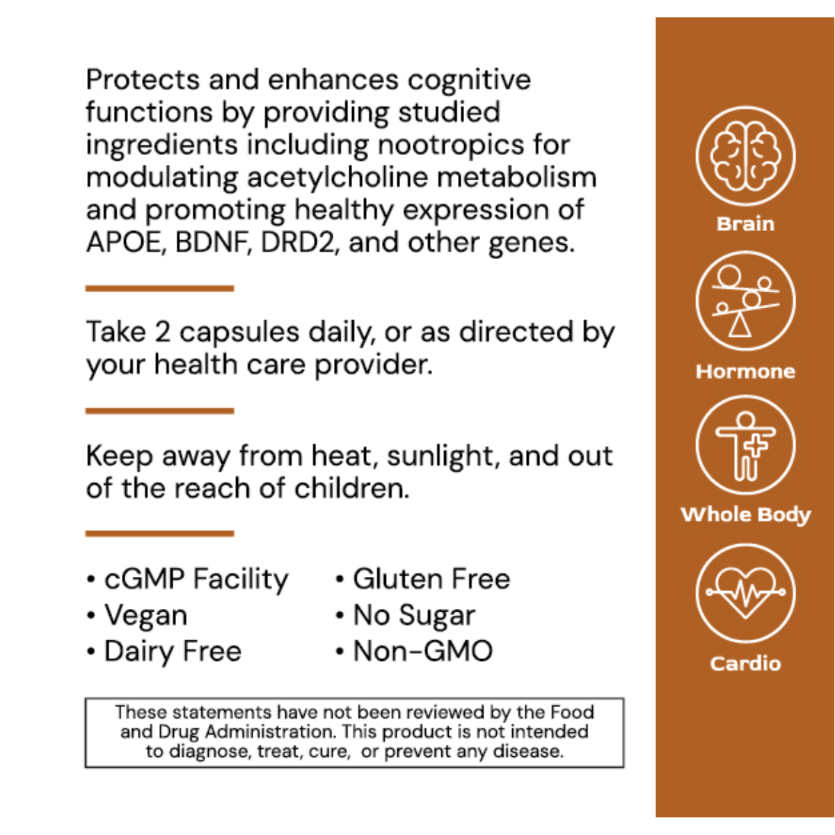 NeuroGenic protects and enhances cognitive functions by providing studied ingredients including nootropics for modulating acetylcholine metabolism and promoting healthy expression of APOE, BDNF, DRD2, and other genes.